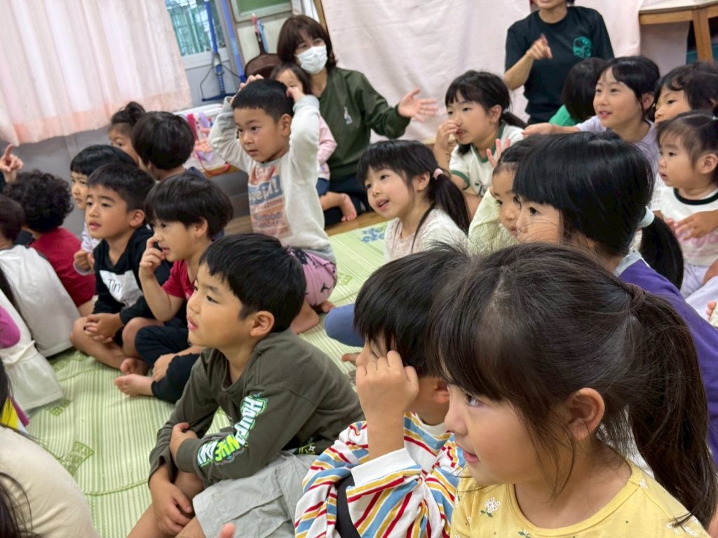 あいさつのうたからはじまり、こどもたちはすぐ入り込んでピカリンのうたを聞きながら
